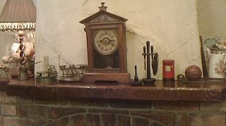 アンティーク時計がマントルピースの天板に飾られ